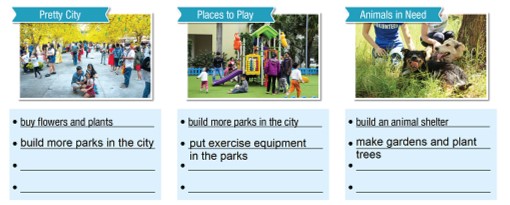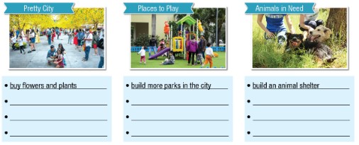 (Hãy nghĩ về những cách bạn có thể cải thiện thành phố của mình. Viết thêm ít nhất ba ý tưởng dưới mỗi bức tranh.)