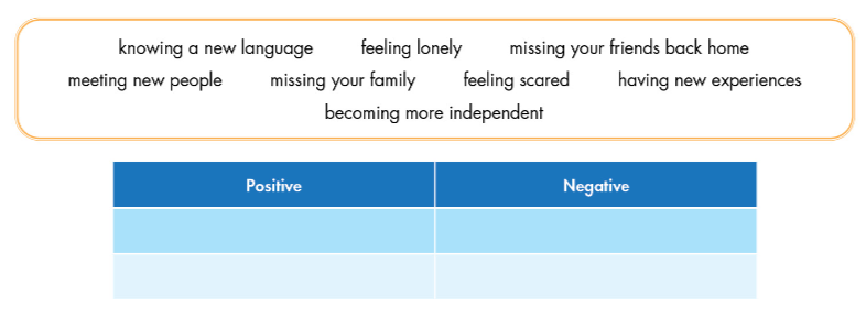 Fill in the table with positive and negative things about studying abroad