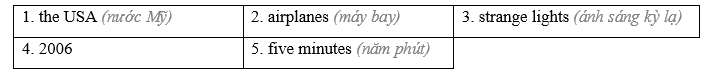 Thông tin: In New Jersey in 2001, people were driving home from work at night when they saw strange lights in the sky. / There was another sighting in 2006, at O’Hare International Airport in Chicago. An airplane was getting ready to take off when a worker saw a disk-shaped UFO.