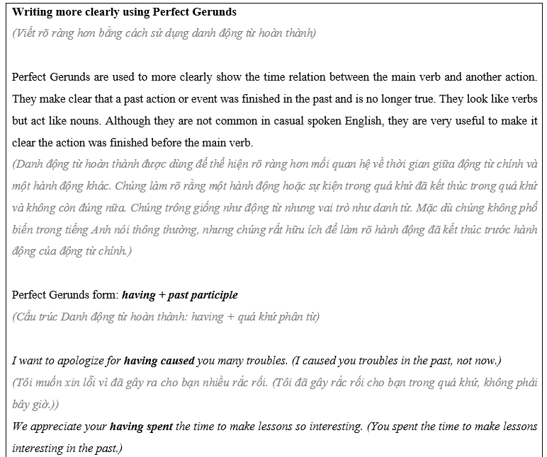 (Viết câu sử dụng các gợi ý. Sử dụng Danh động từ hoàn thành với những từ in đậm để cho thấy chúng đã hoàn tất.)