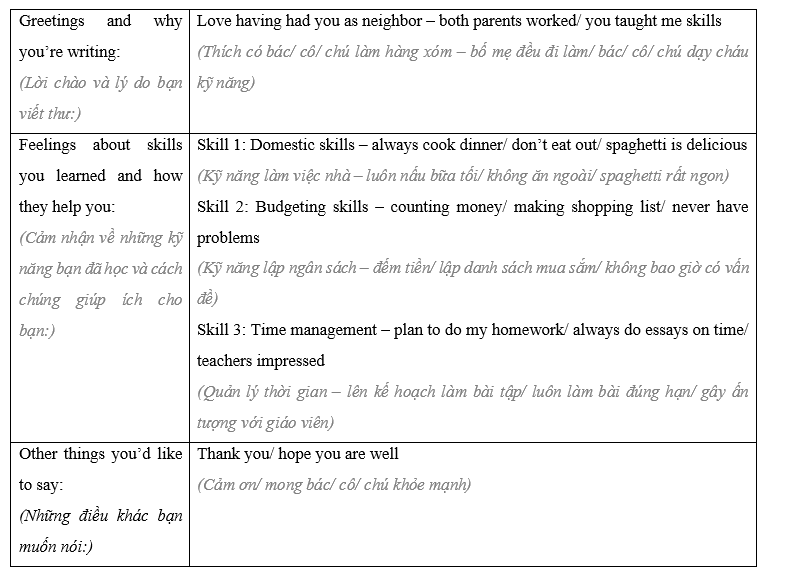 (Bây giờ, hãy viết một lá thư cho người thân hoặc hàng xóm của bạn để cảm ơn họ vì những điều mà họ đã dạy cho bạn. Kể về những kỹ năng họ đã dạy cho bạn, cảm xúc của bạn về những kỹ năng đó và những kỹ năng đó giúp ích cho bạn như thế nào. Sử dụng phần Kỹ năng Viết và đoạn văn bài đọc để giúp bạn. Viết 150-180 từ.)
