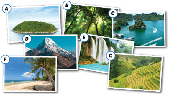 New Words a. Write the letters in the boxes. Listen and repeat. b. Discuss what activities you can do at each place. Listening a. Listening to Tom talking about places to visit. These places are the best for people who like: doing sports/ talking photos. b. Now, listen and number. Useful Language Listen then practice. a. Read the email and underline the natural wonders of Viet Nam. b. Read and circle “True” or “False”.