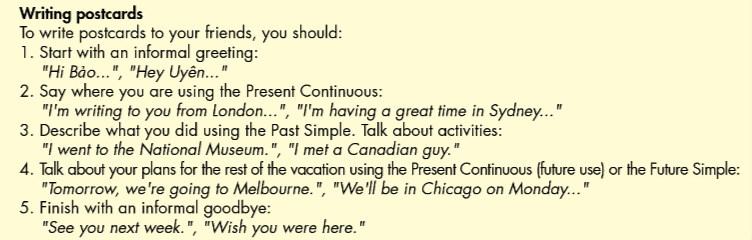 (Bây giờ, sử dụng ghi chú của bạn hoặc ý tưởng của riêng bạn để viết một tấm bưu thiếp cho một người bạn. Viết từ 60 đến 80 từ.)