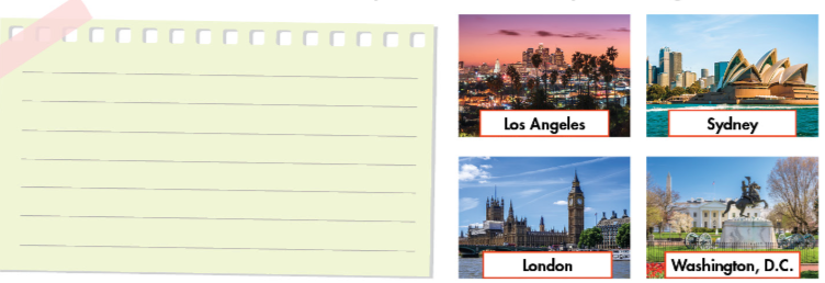 Look at the pictures. Imagine you visited one of these places or choose your own. Make notes on what you did there and how you used English.