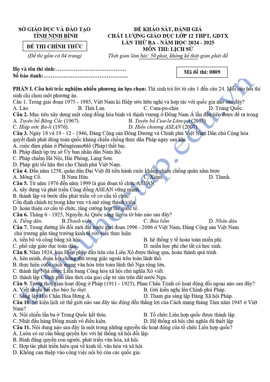 Đề thi khảo sát môn sử lớp 12 tỉnh Ninh Bình 2025 lần 3