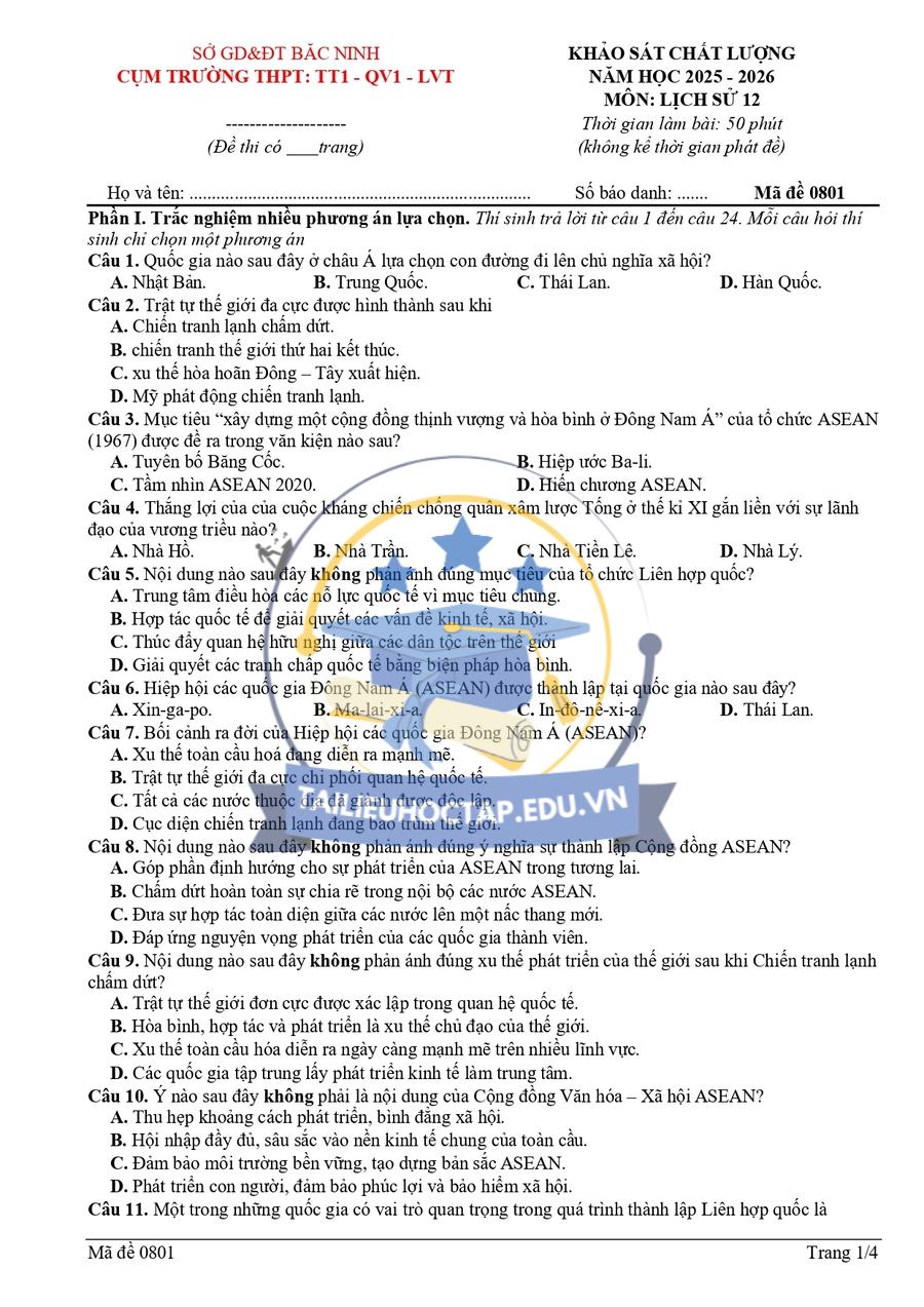 Đề thi KSCL môn lịch sử lớp 12 cụm THPT Bắc Ninh 2026
