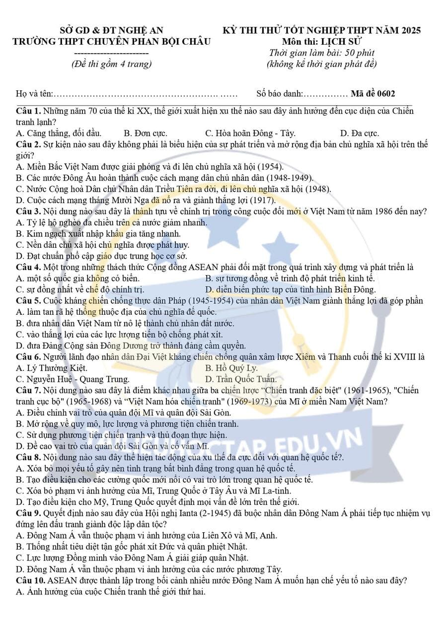 Đề thi thử tốt nghiệp môn sử chuyên Phan Bội Châu 2025 lần 2