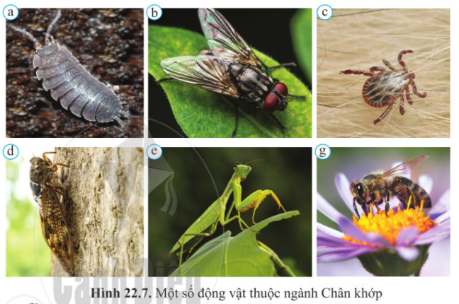Nhận biết tên các động vật thuộc ngành Chân khớp trong hình 22.7 (gợi ý tên của các động vật: ve bò, ong, mọt ẩm, ve sầu, bọ ngựa, ruồi).