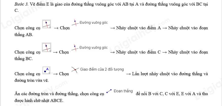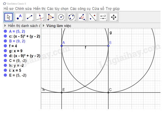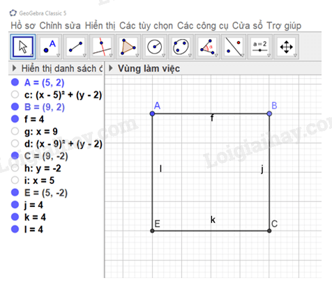 • Ẩn các đường tròn, đường thẳng trong hình trên, ta được hình vuông ABCE như hình vẽ: