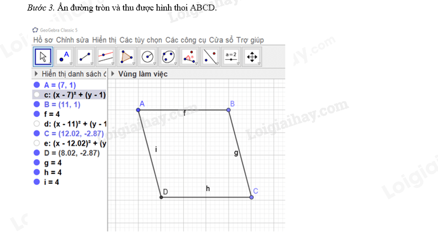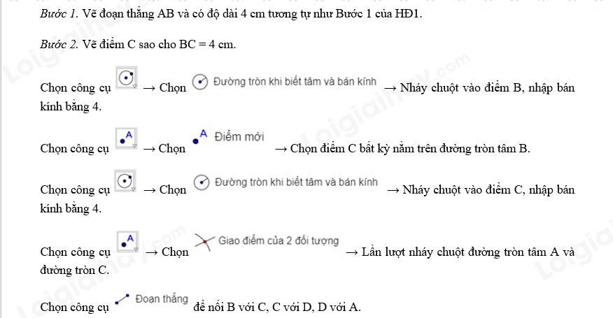 c) Tương tự, ta vẽ một hình thoi ABCD có cạnh 4 cm theo các bước sau: