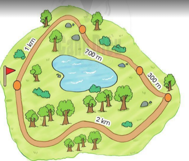 - Tính độ dài của mỗi vòng = 1 km + 700 m + 300 m + 2 km