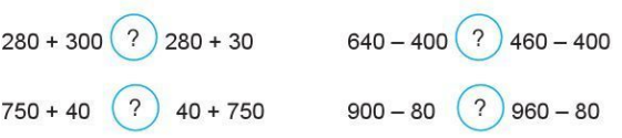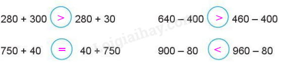 Tính nhẩm kết quả các phép cộng, phép trừ, so sánh hai vế rồi điền dấu thích hợp.