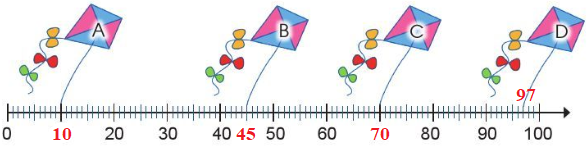 Mỗi cánh diều gắn với vạch chỉ số nào trên tia số dưới đây?