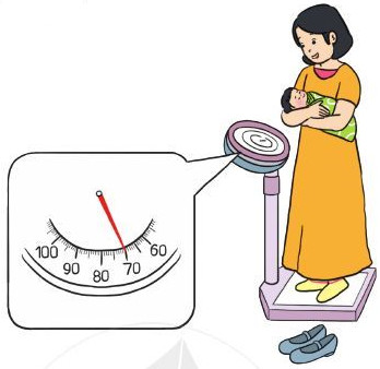 - Quan sát cân rồi đọc số đo chỉ tổng cân nặng của mẹ và em bé trên cân.