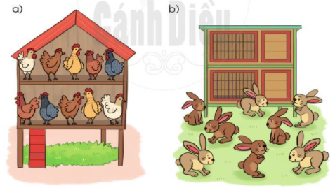Quan sát tranh vẽ, em đếm số con gà, số con thỏ và số tầng của mỗi chuồng từ đón nêu được các phép nhân, phép chia thích hợp