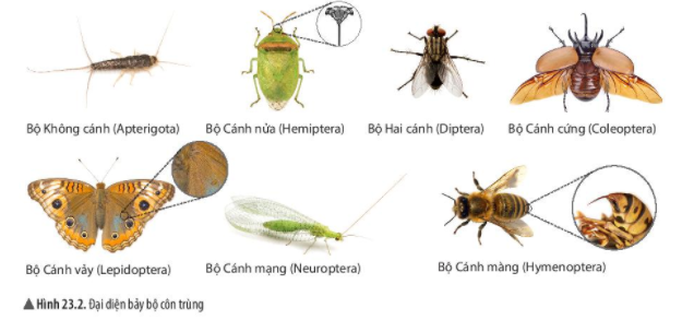Dựa vào hình 23.1, 23.2 và bảng đặc điểm, em hãy gọi tên các bộ côn trùng từ a đến h.