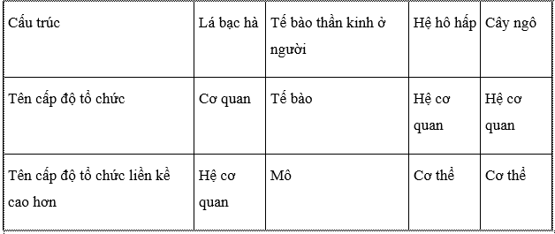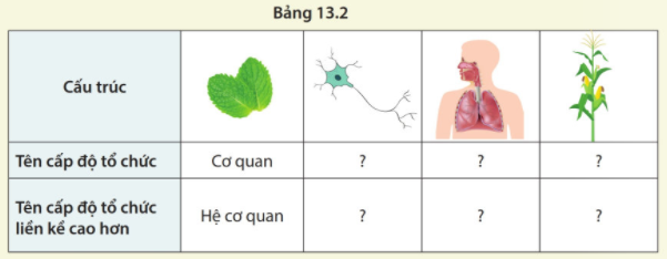 Nêu tên cấp độ tổ chức tương ứng với mỗi cấu trúc đã cho trong bảng 13.2 và tên của cấp độ tổ chức liền kề cao hơn nó trong thứ tự tổ chức cơ thể.