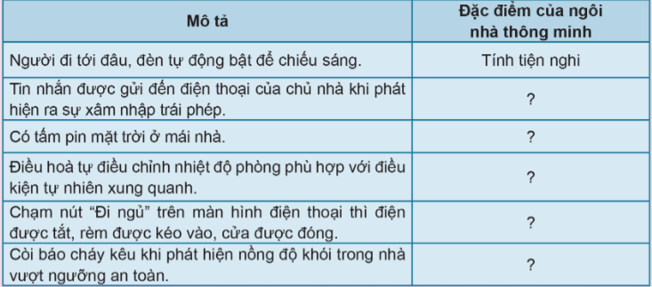 Mô tả trong Bảng 3.2 thể hiện rõ nét đặc điểm nào của ngôi nhà thông minh?