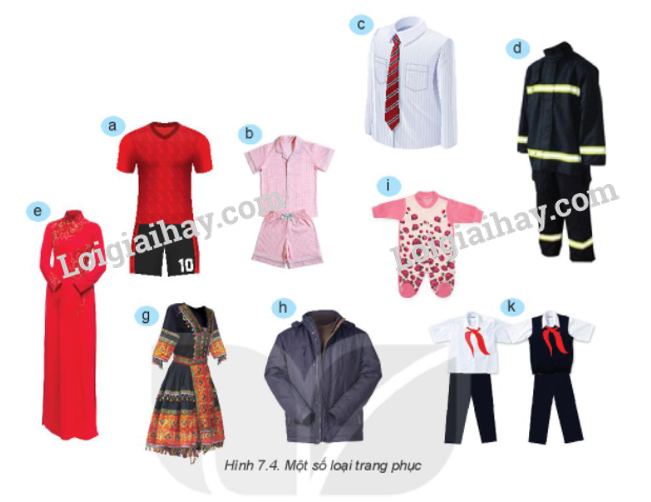- Trang phục mặc thường ngày: b, c, h, i - Trang phục lễ hội: e, g - Trang phục thể thao: a, - Đồng phục: k - Trang phục bảo hộ lao động: d |