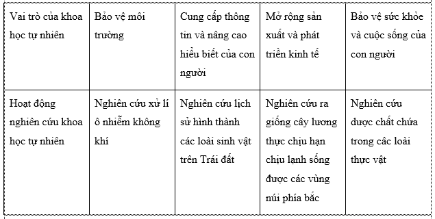 Hãy tìm các hoạt động nghiên cứu khoa học tự nhiên đem lại lợi ích cho cuộc sống của con người theo gợi ý trong Bảng 1.1.
