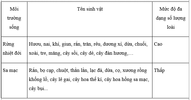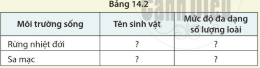 Nhận xét về mức độ đa dạng số lượng loài ở các môi trường sống khác nhau theo gợi ý trong bảng 14.2.