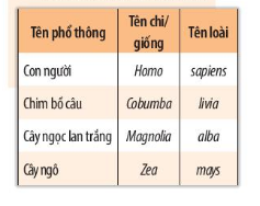 Nêu cách gọi tên khoa học của một số loài sau đây, biết