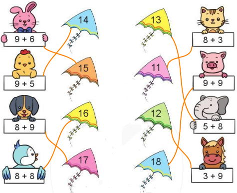Thực hiện tính nhẩm các phép tính trên tấm bảng mà mỗi con vật cầm, sau đó nối với kết quả ghi trên mỗi cánh diều.
