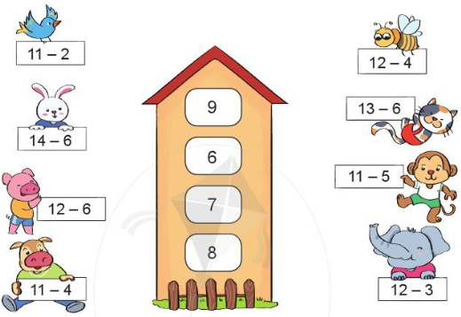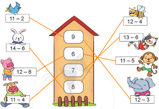 Thực hiện tính nhẩm các phép tính, sau đó nối kết quả với số ở ô trống trong ngôi nhà.