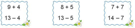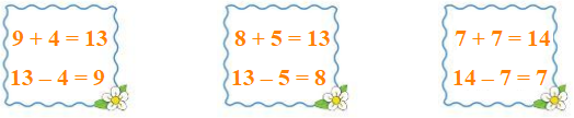 Thực hiện tính nhẩm các phép cộng dựa vào bảng cộng (qua 10) trong phạm vi 20, sau đó dựa vào kết quả phép cộng vừa tính để tìm kết quả các phép tính trừ.