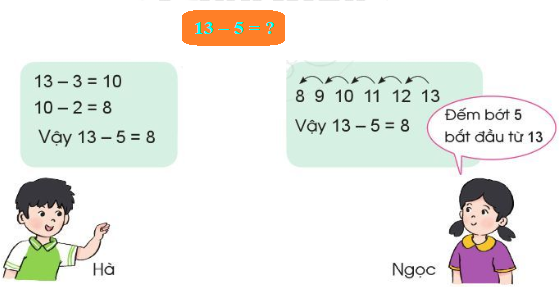 Để thực hiện phép tính 13 – 5, bạn Hà đã tách 5 thành tổng 3 + 2, rồi bạn lấy 13 – 3 = 10, sau đó lấy 10 – 2 để tìm được kết quả là 8.