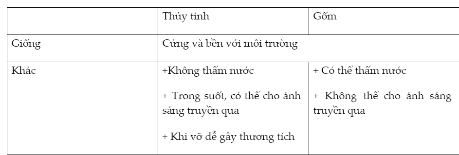- Thủy tinh: bền với môi trường, không thấm nước, không tác dụng với nhiều hóa chất, trong suốt, cho ánh sáng truyền qua, khi vỡ dễ gây thương tích