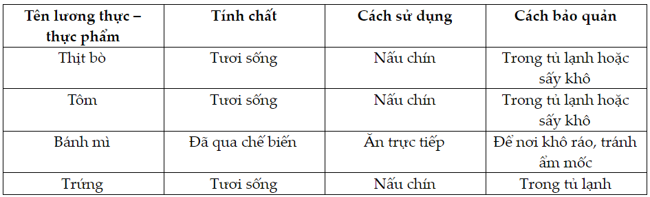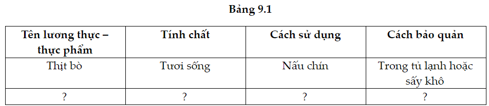 Thực hiện điều tra về tính chất, cách sử dụng và cách bảo quản của một số loại lương thực – thực phẩm thông dụng theo gợi ý trong bảng 9.1