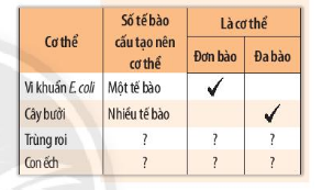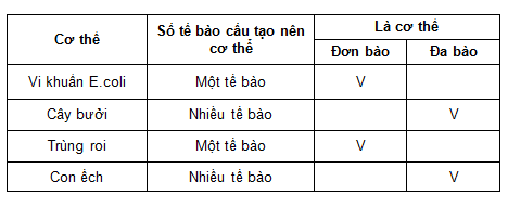 Vẽ lại bảng và xác định các cơ thể đơn bào, đa bào bằng cách hoàn thành bảng theo mẫu sau vào vở: