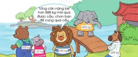b) Tính nhẩm tổng cân nặng của bạn voi và một trong bốn bạn còn lại, nếu tổng cân nặng bé hơn 500 kg thì hai bạn đó cùng được qua cầu.