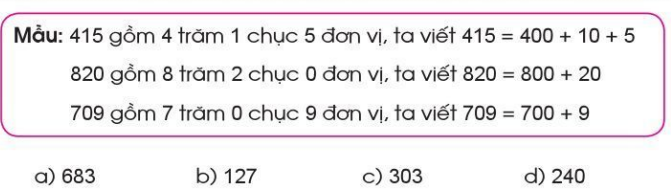 a) 683 gồm 6 trăm 8 chục 3 đơn vị, ta viết 683 = 600 + 80 + 3
