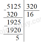 Đặt tính để tính thương và số dư của phép chia: 5 125:320.