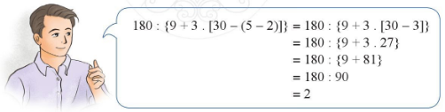 Thầy giáo hướng dẫn học sinh tính giá trị của biểu thức \(180:\left\{ {9 + 3\left[ {30 - \left( {5 - 2} \right)} \right]} \right\}\) như sau: