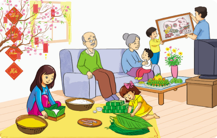 a) Ngày Tết, gia đình đang trang trí nhà cửa.