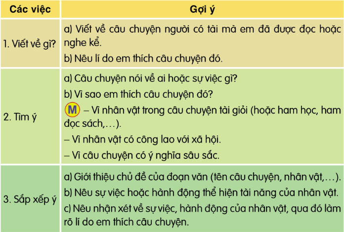 Tìm ý và sắp xếp ý để viết đoạn văn theo đề bài sau: Viết đoạn văn về một câu chuyện người có tài mà em đã được đọc hoặc nghe kể. Cho biết vì sao em thích câu chuyện đó.