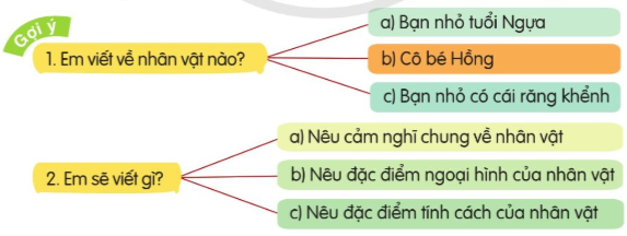 Tìm ý và sắp xếp ý cho 1 trong 3 đoạn văn sau. Nêu cảm nghĩ của em về nhân vật bạn nhỏ trong bài thơ Tuổi Ngựa. Nêu cảm nghĩ của em về nhân vật Hồng trong câu chuyện Làm chị. Nêu cảm nghĩ của em về nhân vật bạn nhỏ trong câu chuyện Chiếc răng khểnh. Trao đổi với bạn để hoàn chỉnh kết quả tìm ý và sắp xếp ý.