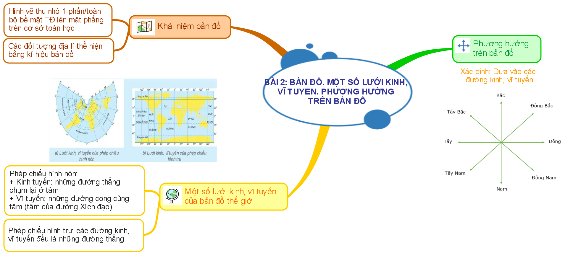 Sơ đồ tư duy bản đồ. Một số lưới kinh, vĩ tuyến. Phương hướng trên bản đồ Địa lí 6 Kết nối tri thức với cuộc sống
