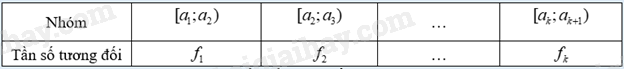 Bảng tần số tương đối ghép nhóm trong đó \(n = {m_1} + ... + {m_k}\) và \({f_1} = \frac{{{m_1}}}{n}.100\left( \% \right)\) là tần số tương đối của nhóm \({\rm{[}}{a_1};{a_2})\),…, \({f_k} = \frac{{{m_k}}}{n}.100\left( \% \right)\) là tần số tương đối của nhóm \({\rm{[}}{a_k};{a_{k + 1}})\). |