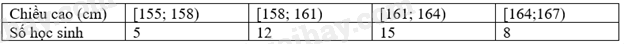 Ta có bảng tần số ghép nhóm cho mẫu số này với các nhóm [155; 158), [158; 161), [161; 164), [164;167) là: