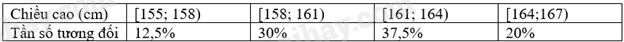 Bảng tần số tương đối ghép nhóm cho mẫu số này với các nhóm [155; 158), [158; 161), [161; 164), [164;167) là: