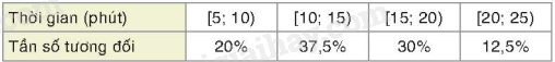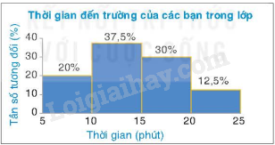 Ví dụ: Vẽ biểu đồ tần số tương đối ghép nhóm dạng cột cho bảng thống kê về thời gian đi từ nhà tới trường của một số bạn trong lớp 9D.