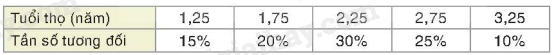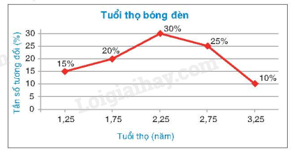 Ví dụ: Vẽ biểu đồ tương đối ghép nhóm dạng đoạn thẳng cho bảng tần số tương đối ghép nhóm về tuổi thọ của một loại bóng đèn: