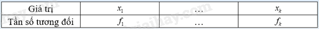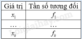 trong đó \(n = {m_1} + ... + {m_k}\) và \({f_1} = \frac{{{m_1}}}{n}.100\left( \% \right)\) là tần số tương đối của \({x_1},...\), \({f_k} = \frac{{{m_k}}}{n}.100\left( \% \right)\) là tần số tương đối của \({x_k}\). Bảng tần số tương đối còn được cho dưới dạng cột: