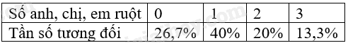 Số anh, chị, em ruột là \({x_1} = 0;{x_2} = 1;{x_3} = 2;{x_4} = 3\) tương ứng với \({m_1} = 8;{m_2} = 12;{m_3} = 6,{m_4} = 4\).