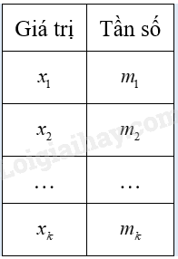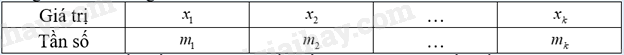 Trong đó \({m_1}\) là tần số của \({x_1}\), \({m_2}\) là tần số của \({x_2}\),…, \({m_k}\) là tần số của \({x_k}\). Bảng tần số cũng được cho ở dạng cột: