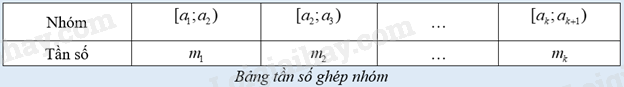 - Số lượng các giá trị của mẫu số liệu thuộc vào một nhóm được gọi là tần số của nhóm đó. - Bảng tần số ghép nhóm biểu diễn tần số của các nhóm số liệu. Bảng gồm hai dòng (hoặc hai cột), dòng (hoặc cột) thứ nhất ghi các nhóm số liệu, dòng (hoặc cột) thứ hai ghi các tần số tương ứng với nhóm đó.\({m_i}\) Bảng tần số ghép nhóm là bảng tần số của các nhóm số liệu: